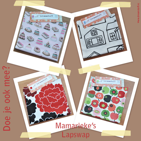 Mamarieke organises a Lapswap. You sent in 4 fabricpieces of 50 x 50 cm and an envelope addressed to yourself (with stamps) and after the swap she sends you 4 new fabricpieces in return. You can read more about it here. I'm a participant and have sent the above shown fabrics this week. One with a cake print, one with houses, one with retroapples and a canvas one with flowers.